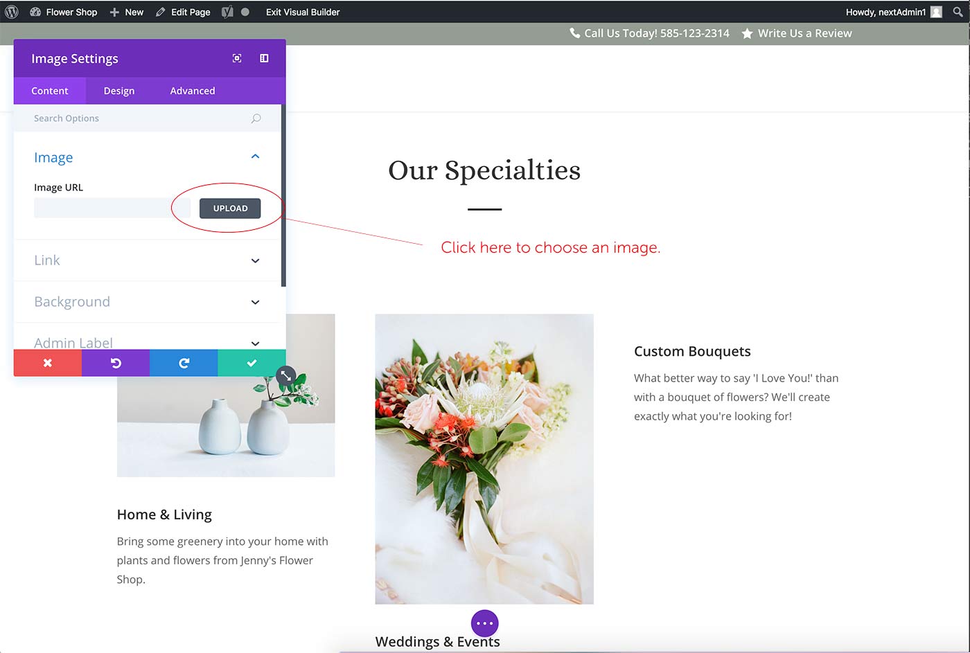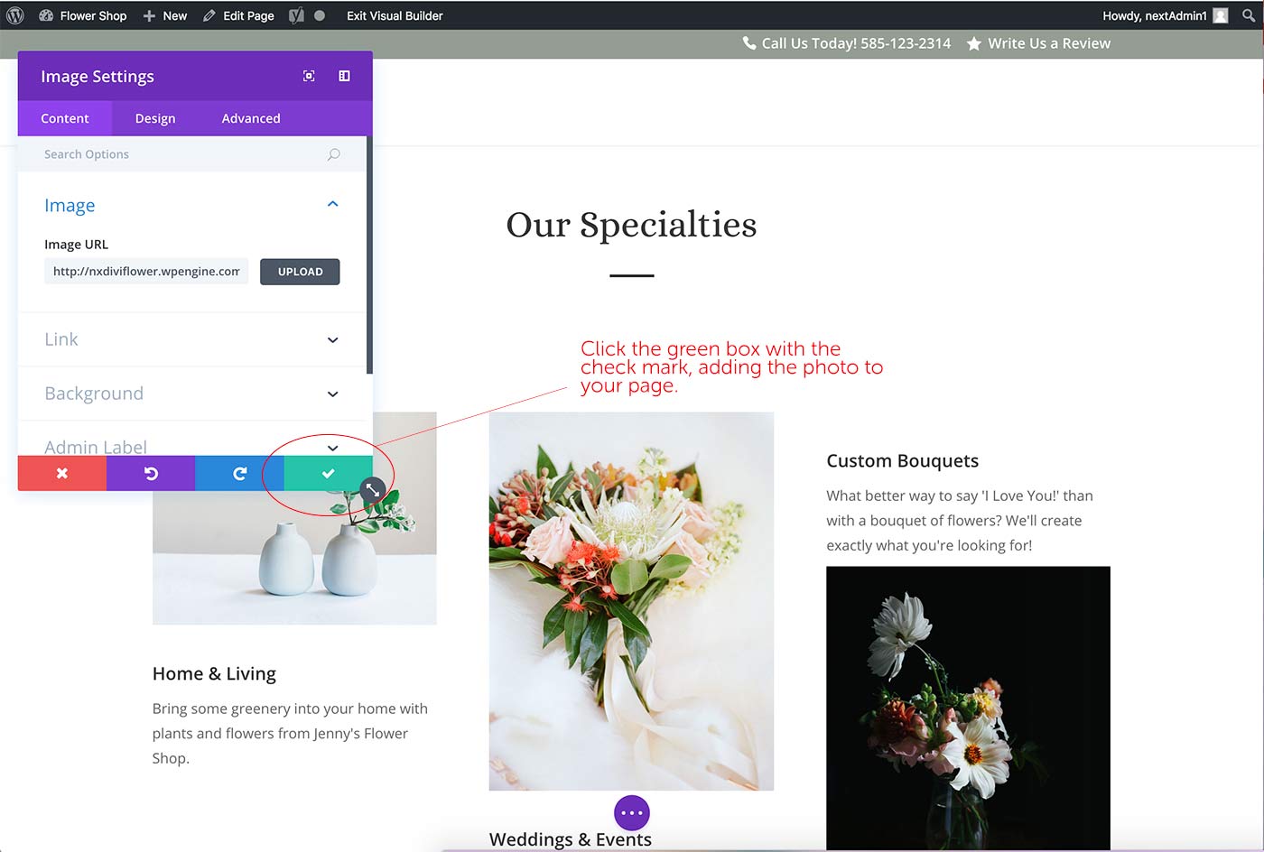 Step 7. Once you choose an image, the ‘Image Settings’ box will reappear. Click the green box with the check mark to finish the upload.
