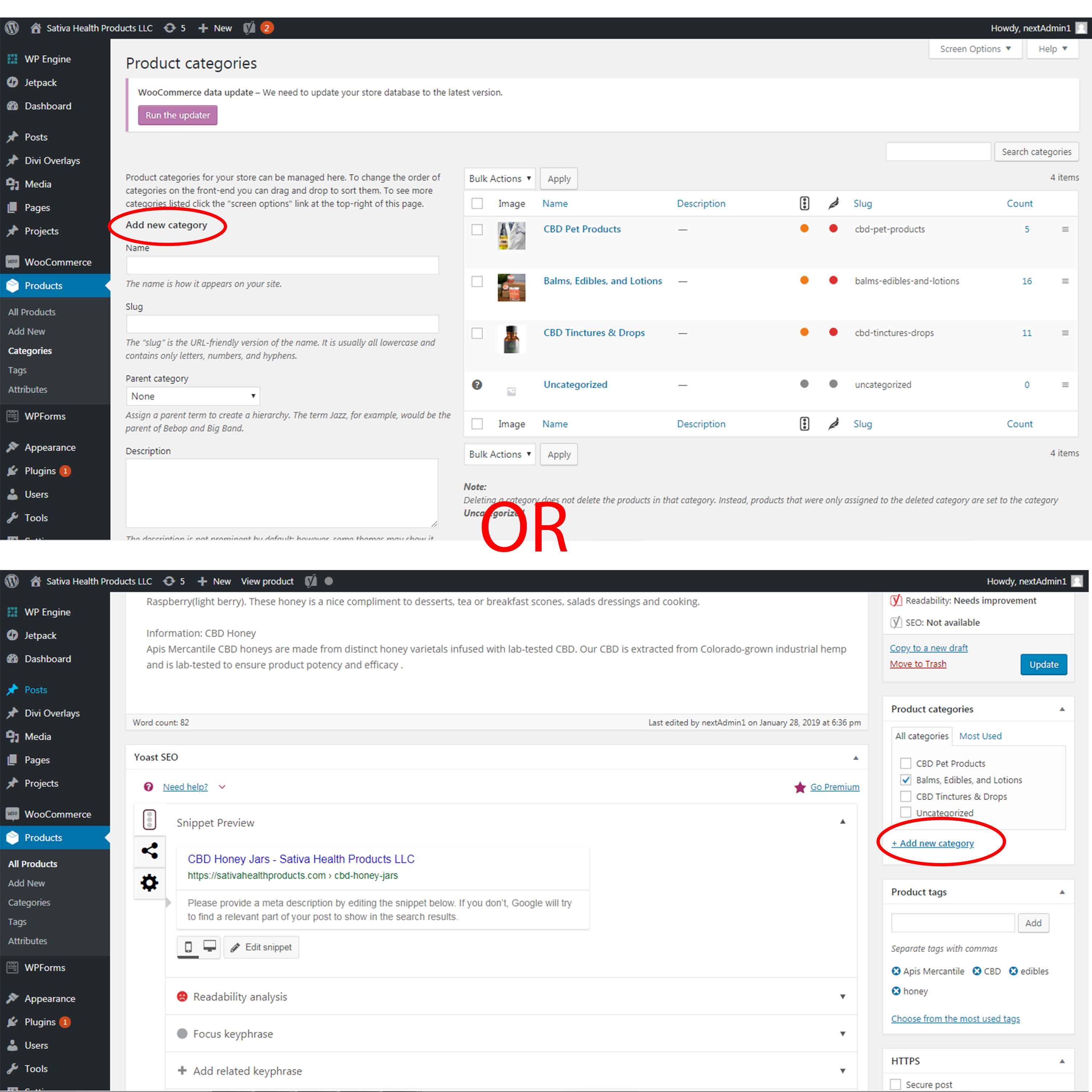 The second way to add product categories is when you are creating new products, or editing existing ones, you can select or add new product categories from the individual product page. Once you have selected the appropriate product categories be sure to click update so you save your changes.